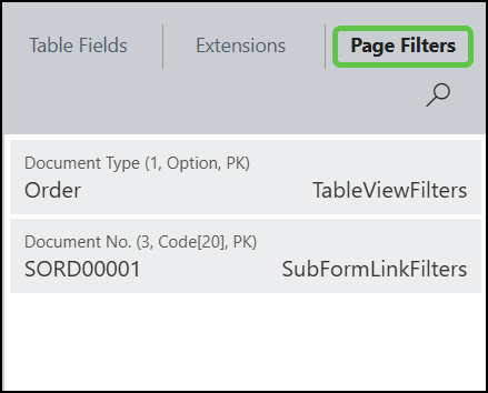 It shows the current page name and number, the underlying table and table number, available fields, a search capability for field names/field numbers/values, installed extensions interacting with the page, and any active page filters.